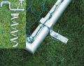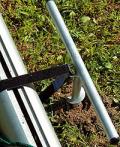 Die Spindel wird in den Boden gedreht und das Klettband um den hinteren Bodenrahmen des Tores gelegt. Der Aufbau erfolgt einfach und schnell und die Tore stehen sicher. Satz bestehend aus 2 Spindeln für 1 Tor.